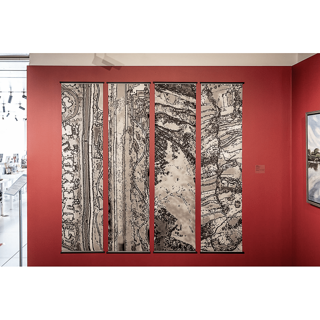J’y ai présenté le quadriptyque Hua Shan tiré de la série Sous le ciel. Dans cette série, j’ai imaginé un parallèle entre les montagnes sacrées traditionnelles de Chine, lieux de spiritualité et de loisirs, et les mégapoles chinoises, lieux de matérialité et de travail. Les panneaux du quadriptyque représentent la montagne sacrée Hua Shan et les mégapoles qui l’entourent. Ces représentations ont été obtenues à partir de Google Earth. Les images satellitaires ont été radicalement transformées par ordinateur jusqu’à un point de quasi-abstraction. Chaque panneau est une impression numérique sur papier japonais texturé.