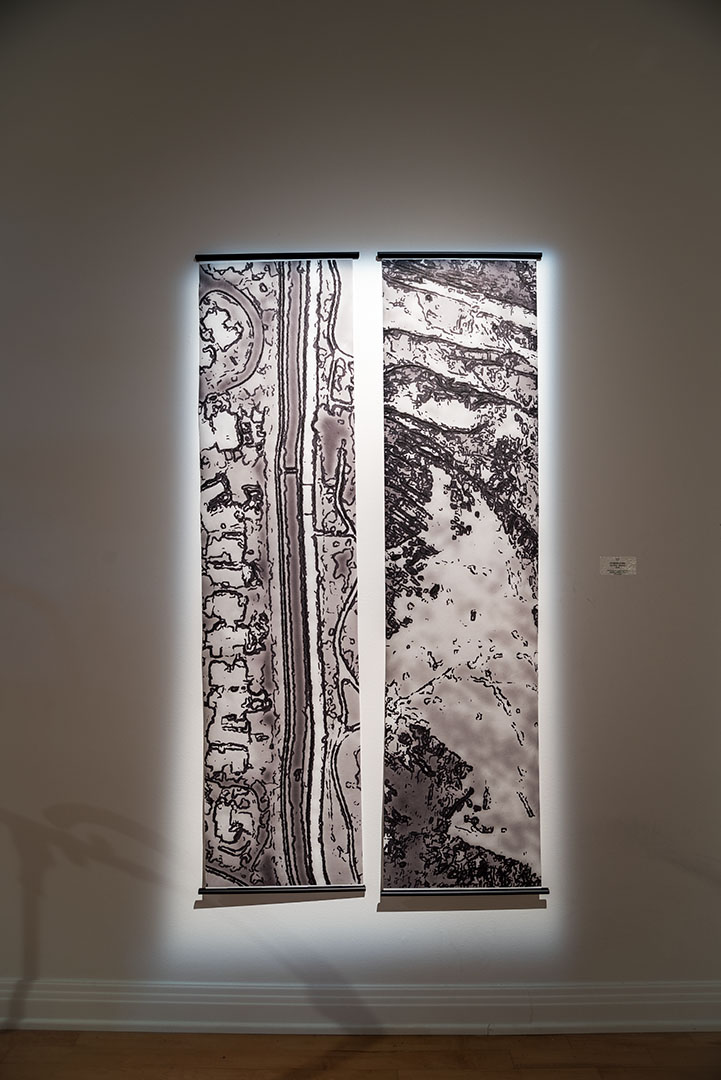 J’y ai exposé un diptyque sur papier japonais de la série Sous le ciel qui trace un parallèle entre la montagne sacrée chinoise de Hua Shan, lieu de spiritualité et de loisirs, et la ville voisine de Xi’an, lieu de matérialité et de travail. Les représentations ont été obtenues à partir de GoogleEarth. Les images satellitaires ont été radicalement transformées par ordinateur jusqu’à un point de quasi-abstraction.