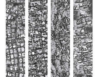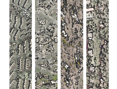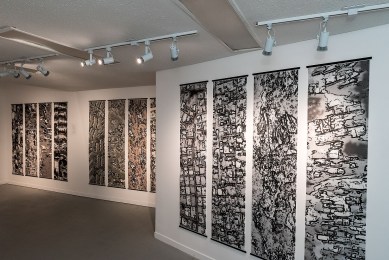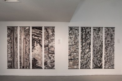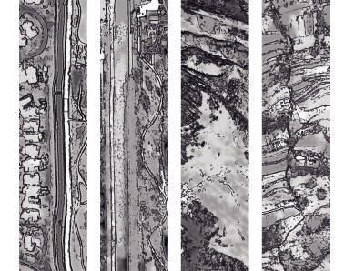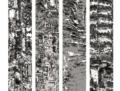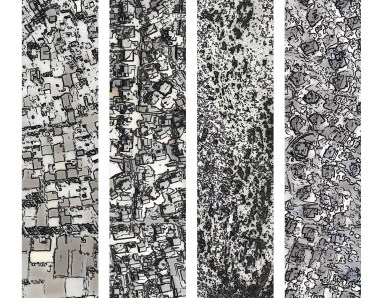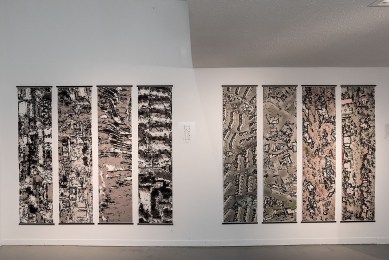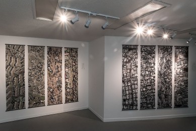 Dans la création de Sous le ciel, j’ai imaginé un parallèle entre les montagnes sacrées traditionnelles de Chine, lieux de spiritualité et de loisirs, et les mégapoles chinoises, lieux de matérialité et de travail. Je fais se côtoyer le yin de la nature et le yang de la civilisation. L’accrochage comprend cinq quadriptyques. Chaque partie d’un quadriptyque est une impression numérique sur papier japonais texturé. On y retrouve une référence directe au rouleau chinois. Les panneaux des quadriptyques représentent des paysages des cinq montagnes sacrées et ceux de quinze mégapoles. Ces représentations ont été obtenues à partir de GoogleEarth. Les images satellitaires ont été radicalement transformées par ordinateur jusqu’à un point de quasi-abstraction. Ces images adoptent une forme esthétique omniprésente dans l’art pictural chinois : le mariage du flou et du net, celui du lavis et du tracé.